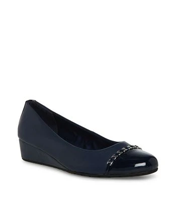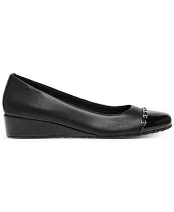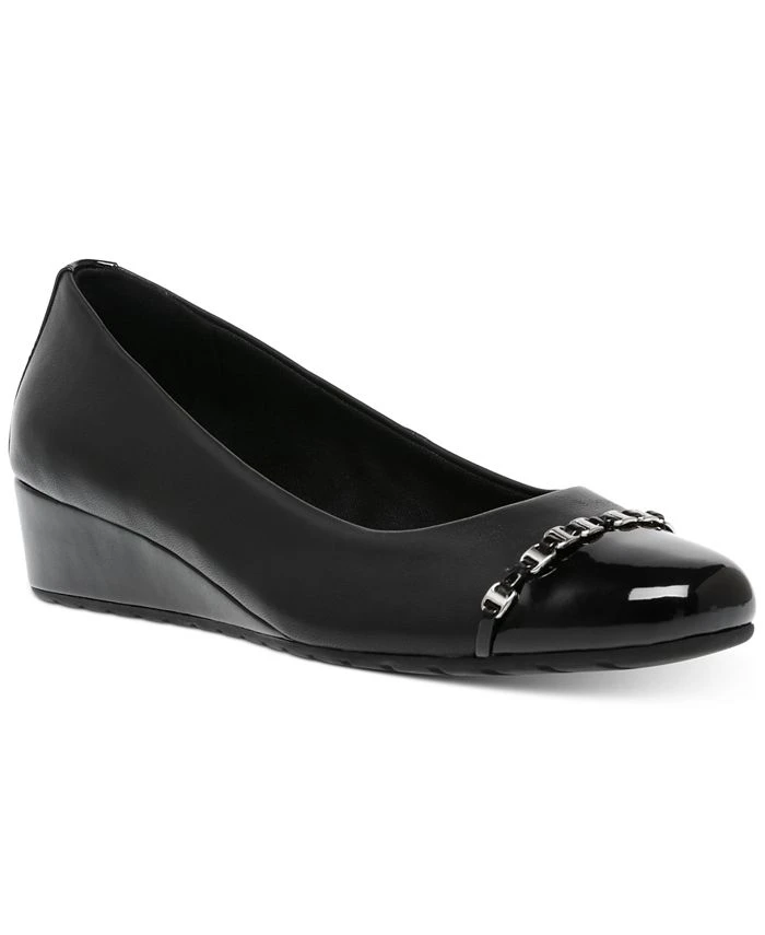 Chain hardware and patent cap-toes bring striking polish to dressy looks elevated by a chic wedge lift in the Maysel slip-ons from Anne Klein.