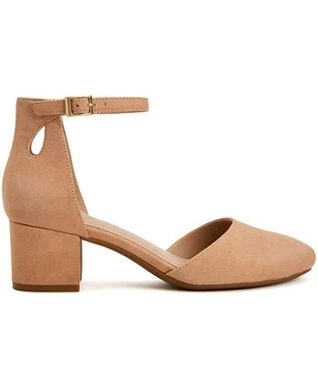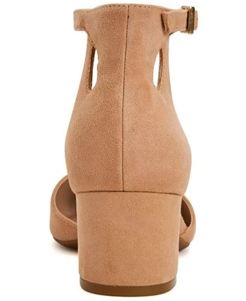 - Round-toe two-piece pumps with adjustable buckle closure at ankle-strap