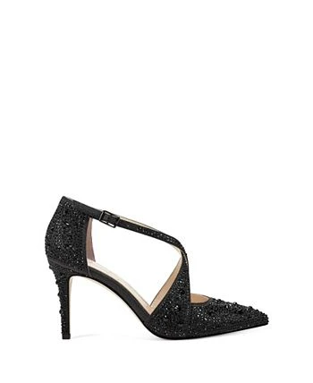 Cut in a classic silhouette with a pointed toe and crisscross straps, the Jessica Simpson Accile turns up the glamour. The showstopping occasion heel is coated in glitter and topped with sparkling faux jewels of every size for gorgeous effect.