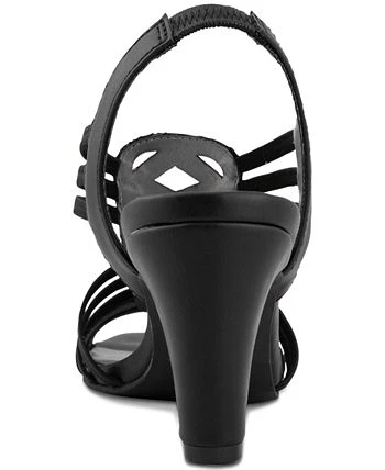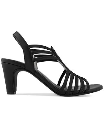 Slender straps radiate from a wide woven T-strap detail in the chic Danely stilettos by Karen Scott.