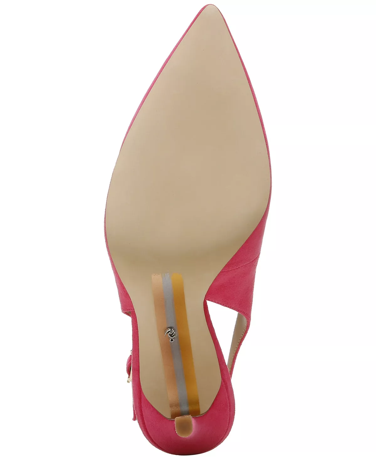 - Pointed-toe slip-on slingback pumps with adjustable buckle closure