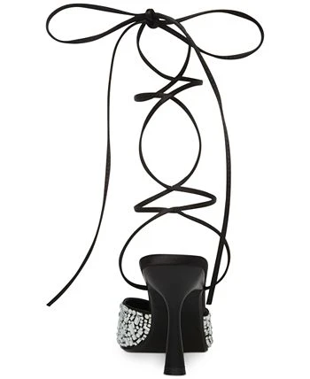 - Wrapping ankle tie design; rhinestone embellishments at upper