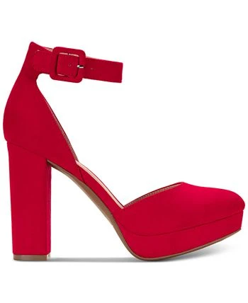 - Round-toe ankle-strap platform pumps with adjustable buckle closure